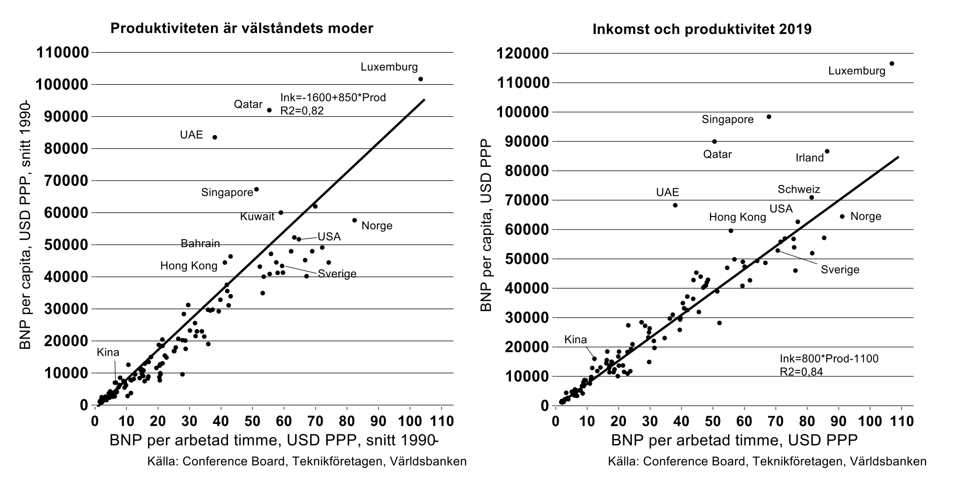 Återvänder vi till databasen för närmare 200 länder, framgår det däremot tydligt att produktivitet och inkomst per capita varit mycket nära relaterade de senaste 30 åren. Återigen med undantag av några extrema länder, ligger de flesta ekonomier trädda som på ett snöre tätt intill regressionslinjen (se bilden nedan till vänster). I genomsnitt under perioden har skillnader i produktivitet förklarat drygt 80 procent av skillnaderna i ekonomiskt välstånd mellan länder. Fokuserar vi på 2019 – det senaste dataåret i detta fall – finns ett ännu starkare samband (se bilden nedan till höger).