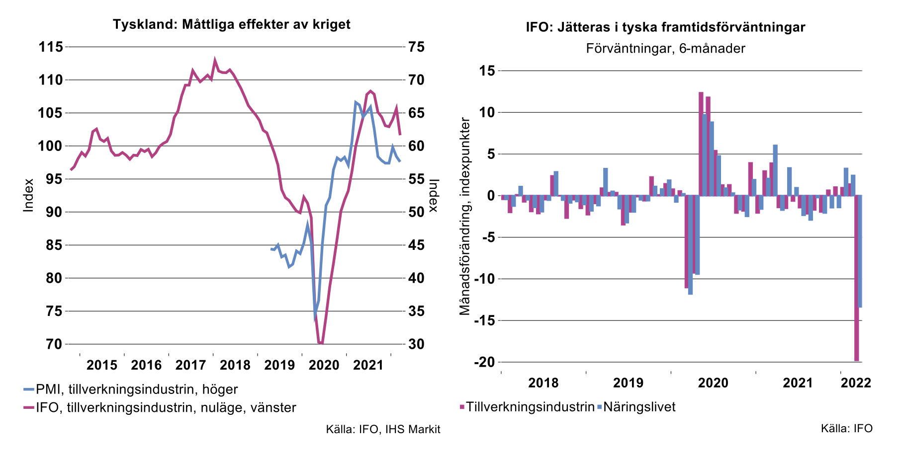 Nu är ju inte framtidsförväntningarna på 6-månaders sikt med nödvändighet detsamma som utfallet. Likafullt är det ett kraftfullt varningstecken, en nyckelfaktor för företagens investeringsvilja är osäkerhet om framtiden. Visserligen kommer rimligen stora strukturella investeringar att rulla på trots krigsoro, så länge den geopolitiska situationen inte blir påtagligt värre. Däremot finns det anledning att räkna med att andra, mer kortsiktiga, investeringar läggs på is tills sikten klarnat. Ju längre kriget och osäkerheten består desto större effekter lär detta dessutom få på näringslivets investeringsvilja.