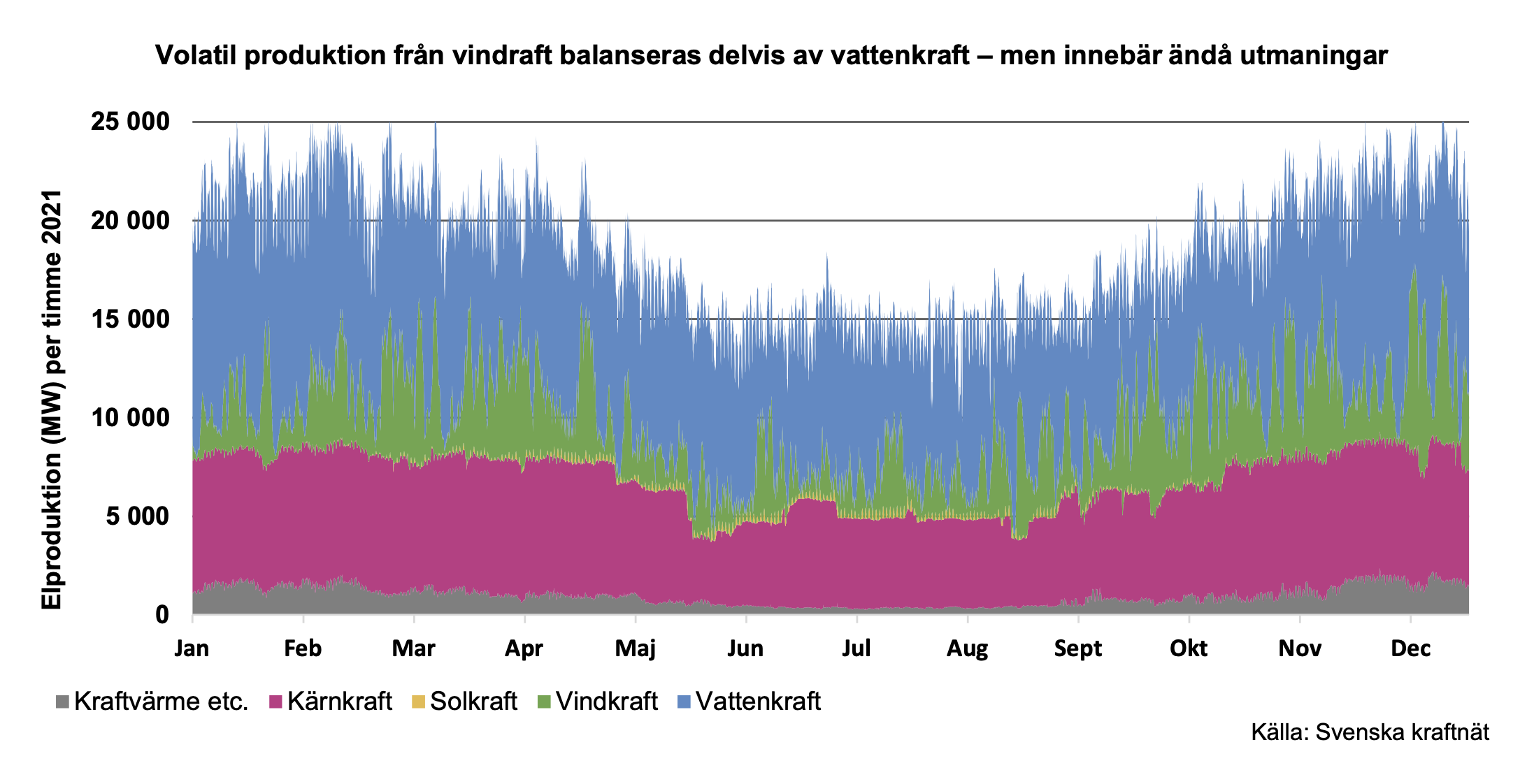 Enbart det faktum att vindkraften är så volatil indikerar att en stor andel vindkraft utsätter elsystemet för påfrestningar. Dock hade vattenkraften relativt väl kunnat hantera vindkraftens variationer enbart i ett svenskt perspektiv.