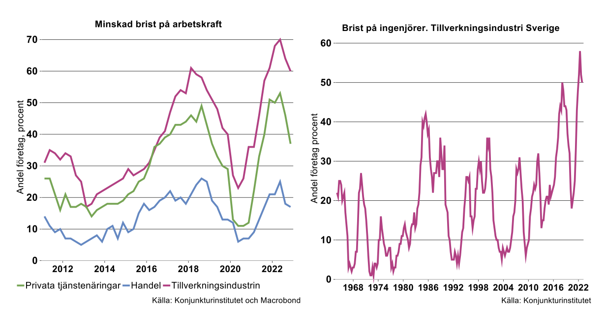 Konjunkturinstitutet frågar även företagen om de upplever att de har brist på arbetskraft i allmänhet och de ställer även frågor om bristen på exempelvis ingenjörer. När det gäller situationen i allmänhet har företagen i många delar av näringslivet angivit relativt stor och växande brist på arbetskraft fram till andra kvartalet 2022. Därefter har bristsituationen lättat (se diagram ovan till höger.