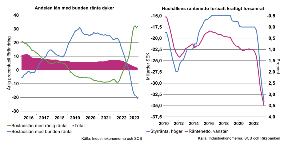 När räntorna stiger blir det allt mindre attraktivt att välja bostadslån med bunden ränta över bostadslån med rörlig ränta. SCB:s finansmarknadsstatistik visar tydligt hur andelen bostadslån med rörlig ränta blir en allt större andel av den totala stocken, se figuren nedan till vänster.