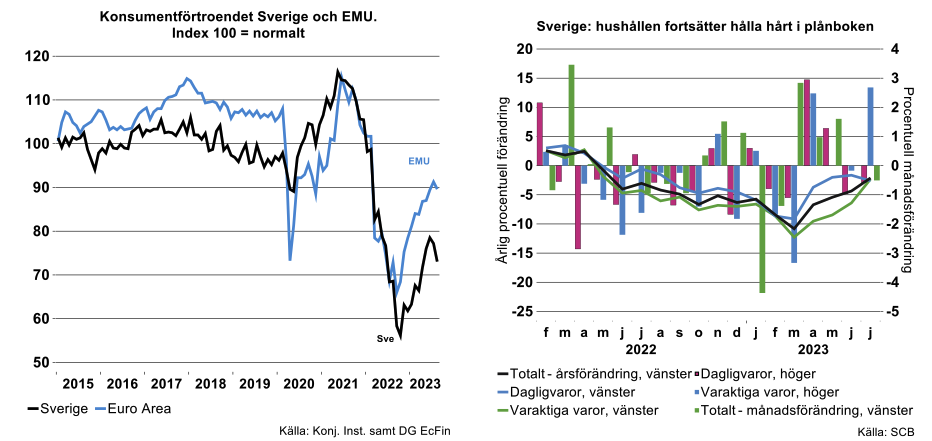 Vid årsskiftet 2022/2023 började konsumentförtroendet förbättras från den rekordlåga nivån från hösten 2022 och nådde en topp i juni i år om än klart under normalindex 100. Därefter har index återigen försämrats under juli och augusti i år.
