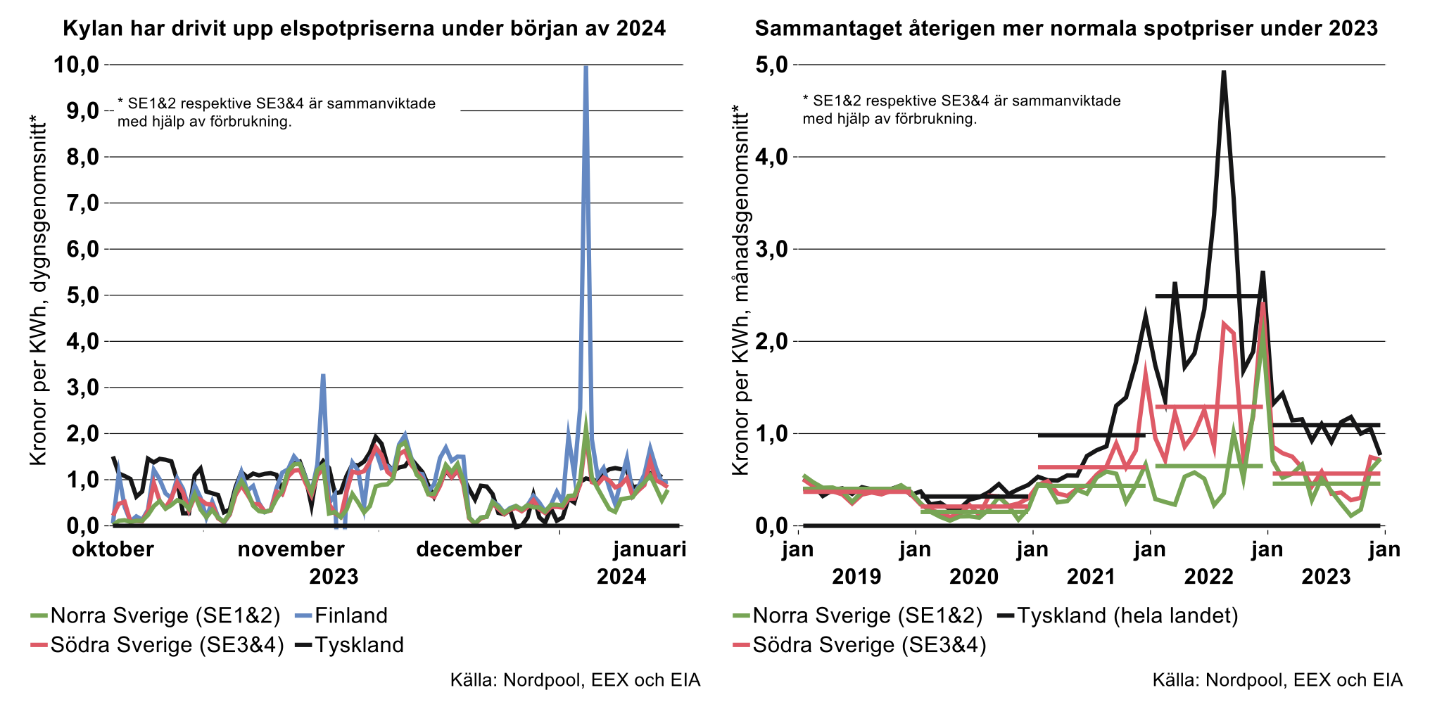 Nu när kylan bitit sig fast i norra Europa och vi befinner oss en bit in i januari kan utvecklingen på elmarknaden överblickas såväl för de senaste veckorna som för hela 2023. Det ökade elbehovet till följd av kylan har bidragit till att driva upp prisnivåerna under januari, vilket framgår av den vänstra figuren nedan. Mest framträdande är det höga spotpriset i Finland den 5 januari, då dygnsgenomsnittett landade på hela 10 kr per kWh. Även i Sverige har prisnivåerna vissa dagar och timmar landat högt, men sammantaget är de ända långt under vad de var under rekordmånaderna 2022.