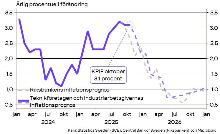 Diagram 5. Inflationsprognoser från Teknikföretagen och Industriarbetsgivarnas samt Riksbanken.