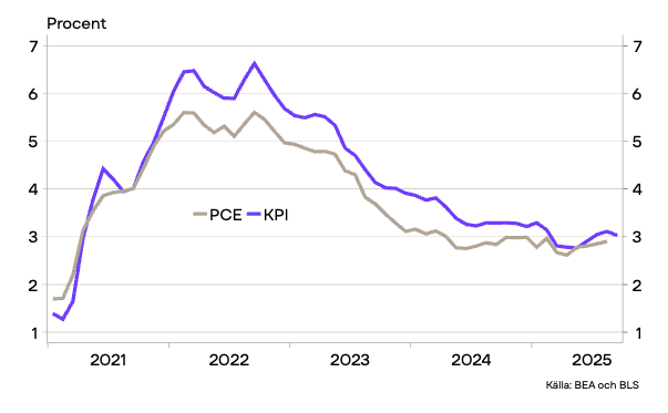 Inflationen i USA har ännu inte kommit ned till målnivån. Kärninflationen enligt PCE-måttet har legat kring – eller strax under – 3 procent i snart två år, utan att uppvisa någon tydlig trend vare sig uppåt eller nedåt (se diagram 2). Osäkerheten är dock ovanligt stor, eftersom publiceringen av inflationsstatistik (och annan viktig statistik) har skjutits upp – eller kanske ställts in – till följd av den tidigare nedstängningen av federala myndigheter. Det innebär att det senaste utfallet för PCE-inflationen avser augusti, medan det senaste KPI-utfallet avser september.
