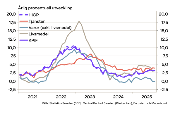 Att inflationen blir högre när energipriserna inkluderas beror på att elpriserna ökar mer än priserna på andra varor och tjänster i konsumtionskorgen, vilket inte varit fallet sedan februari 2023. Att elpriserna skulle bidra till att hålla uppe inflationen var väntat baserat på terminsprisutvecklingen på el. Även tjänstepriserna steg under oktober, där högre priser på bland annat restaurang och hotell bidrog positivt. Utöver höjda tjänstepriser och högre elpriser bidrog även högre pris på livsmedel och alkoholfria drycker samt resor till att KPIF-inflationen låg kvar på samma nivå som i september. Samtidigt var prisutvecklingen på varor exklusive livsmedel och på drivmedel mer dämpad.