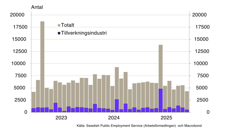 Även Arbetsförmedlingens statistik för november såg uppmuntrande ut. Andelen inskrivna öppet arbetslösa fortsatte sjunka för femte månaden i rad. Antalet varsel fortsatte också sjunka tillbaka och var på sin lägsta nivå sedan december 2022. Även antalet varsel i tillverkningsindustrin var på en lägre nivå än tidigare under året.