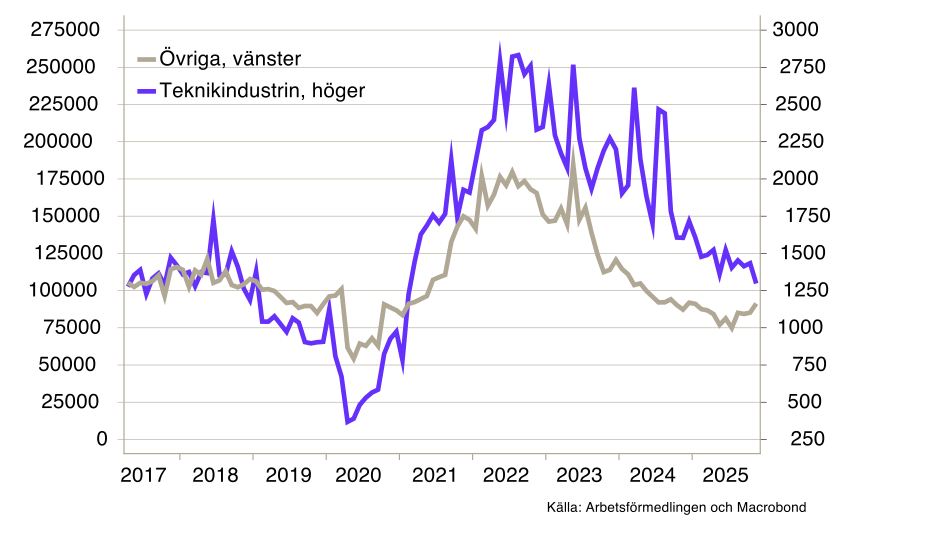 Vi förväntar oss ett uppsving i nya lediga jobb framöver efter den tydliga förbättringen av anställningsplaner i Konjunkturinstitutets senaste barometer. I november fortsatte de lediga jobben visserligen att öka, men de ligger fortfarande på relativt låga nivåer historiskt sett. Statistiken är lite mer volatil för teknikindustrin specifikt, men under de senaste månaderna har vi inte sett samma ökning som för övriga delar av näringslivet. I november sjönk antalet nya lediga jobb i alla delbranscherna.