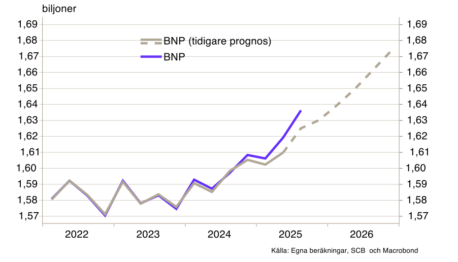Även tidigare BNP-utfall har reviderats upp. Det gör att BNP-tillväxten för 2025 troligtvis blir något högre än i vår tidigare prognos och man kan nog räkna med en tillväxt på drygt 1,5 procent för i år. Nästa år blir tillväxten klart högre. Ungefär 3 procent ser ut som en bra utgångspunkt i dagsläget men det är osäkra tider och mycket kan hända. På finansiella marknader lutar man nu åt att Riksbanken höjer räntan under andra halvan av nästa år, vilket inte är orimligt givet att konjunkturläget förbättras. En förändrad penningpolitik på Riksbankens kommande möte kan vi dock se som uteslutet.