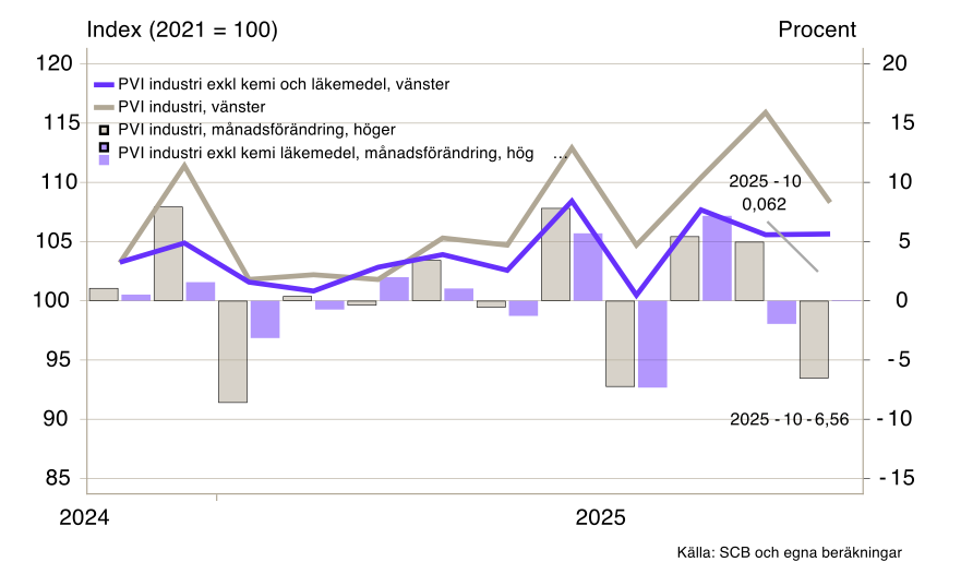 Utvecklingen i PVI för industrin sammantaget är notoriskt svängig, men ändå var förändringen något större än vanligt.1 Vidare är det viktigt att lyfta att det finns en delbransch inom industrin – kemi- och läkemedelsindustrin – som både förklarar en stor del av variationen för industrin sammantaget de senaste åren och som dessutom har bidragit tydligt positivt till trendutvecklingen. Diagram 2 nedan illustrerar att (i) PVI för industrin exklusive kemi- och läkemedelsindustrin var oförändrad i november, och (ii) att mycket av uppgången i PVI sedan första kvartalet i år beror på kemi- och läkemedelsindustrin.