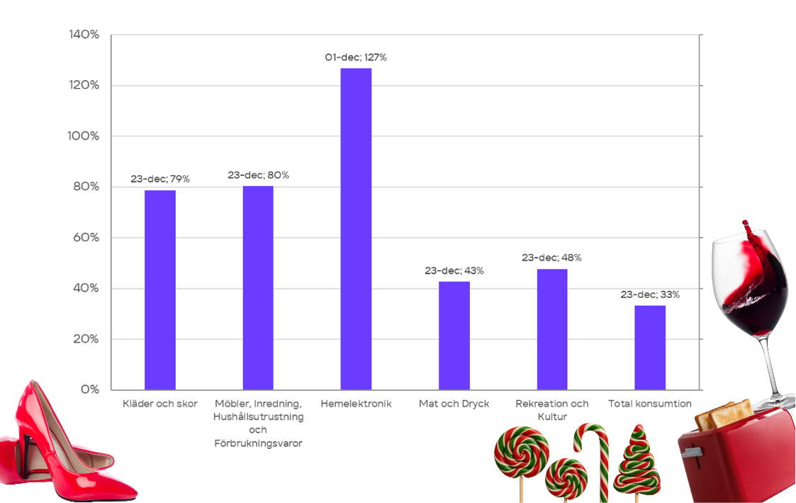 Statistik över hushållens kortanvändning i december visar att många inköp når sin topp den 23 december, dagen före julafton. För Kläder och Skor ligger konsumtionen 79 procent högre än genomsnittskonsumtionen för kategorin. För Möbler och Inredningsprodukter är konsumtionen 80 procent högre, medan Mat och Dryck ligger 43 procent högre och Rekreation och Kultur ligger 48 procent högre.