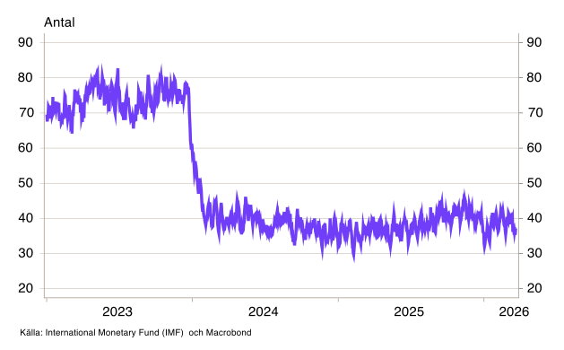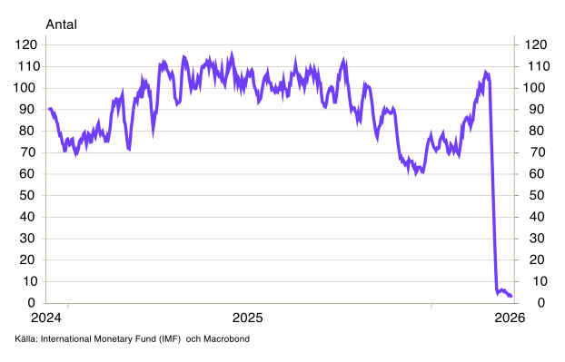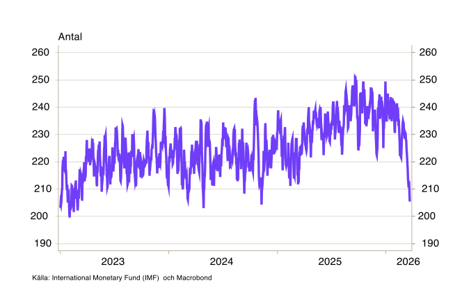 Den mest direkta och omedelbara effekten av konflikten syns i sjöfarten och på råvarumarknaderna. Trafiken genom Hormuzsundet har i praktiken avstannat helt (se diagram 1), och konsekvenserna börjar sprida sig. Det mesta av olje- och gastransporterna till Asien passerar normalt Malackasundet, och trafiken där har minskat betydligt de senaste veckorna. Däremot har vi ännu inte sett påtagliga effekter på trafiken genom Suezkanalen eller runt Godahoppsudden (se diagram B1-B3).