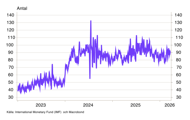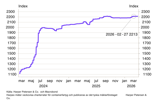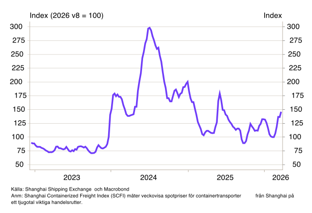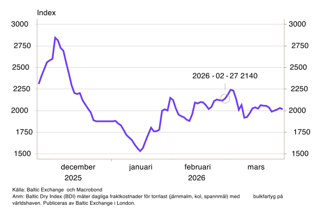 Containerfraktpriserna har ökat betydligt sedan månadsskiftet februari/mars. Enligt Shanghai Containerized Freight Index (SCFI) har spotpriserna stigit med omkring 50 procent sedan konflikten i Mellanöstern eskalerade (se diagram 2). Däremot syns uppgången inte i de mer välkända fraktindexen Harpex och Baltic Dry Index (BDI) (se diagram B6-B7). BDI mäter spotpriser för torrlast som järnmalm och spannmål, vars dominerande handelsrutter – exempelvis Brasilien till Kina och Australien till Japan – inte passerar konfliktområdet och därför påverkas i betydligt lägre grad. Harpex mäter långtidskontrakt för containerfartyg på 6–12 månader och reagerar därför betydligt trögare på akuta störningar. SCFI fångar istället de omedelbara spotpriserna för containertransporter och är därför ett mer känsligt och snabbrörligt mått på hur konflikten i Mellanöstern påverkar de globala fraktkostnaderna. För övriga transportkostnader, såsom vägtransporter, är statistiken svårare att få tag på, men med ett dieselpris som stigit med närmare 40 procent i Sverige sedan konflikten startade är det rimligt att anta att kostnadstrycket letar sig uppåt även i andra transportslag.