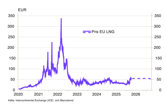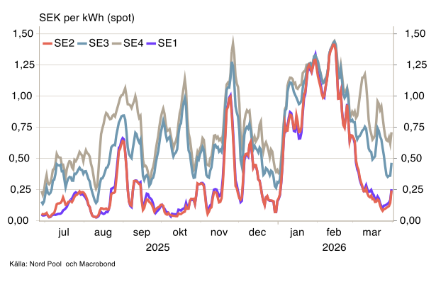 Trots de kraftigt stigande olje- och gaspriserna har vi hittills inte sett några större genomslag på de svenska elpriserna (se diagram 3). Det är värt att hålla ögonen på, men ännu har det inte utvecklats på ett sätt som borde generera oro.