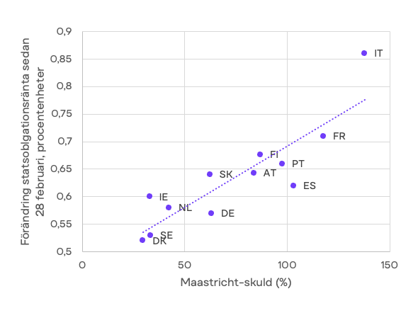 Tydligare är reaktionerna på de finansiella marknaderna. Aktiekurserna har fallit brett (se diagram B8) sedan konfliktens utbrott och volatiliteten har varit påtaglig, vilket bekräftas både av de faktiska kursrörelserna och av volatilitetsindexet VIX (se diagram B9). Statsskuldräntorna i Europa har stigit markant – med 50 till 75 punkter på tvååriga statspapper i de flesta länder – och mönstret är tydligt: länder med redan hög statsskuld, som Frankrike och Italien, har drabbats hårdast (se diagram 4).