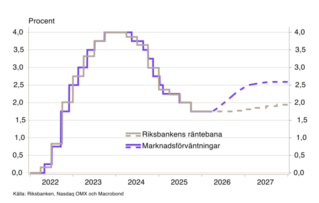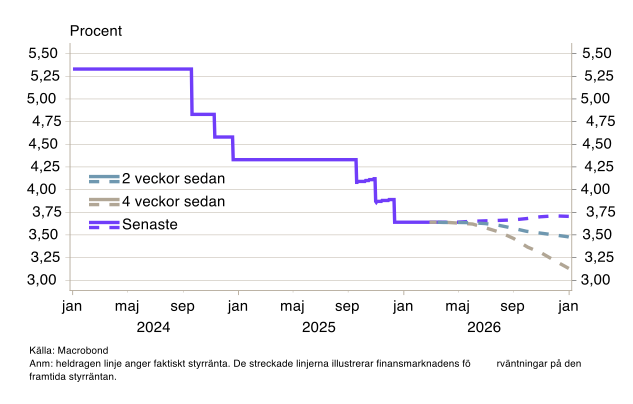 Marknadens förväntningar har skiftat markant. För USA har bilden svängt från att prisa in två sänkningar under 2026 till att nu förvänta sig höjningar (se diagram B11). I Sverige räknar marknaden med uppemot fyra höjningar om 25 punkter vardera det kommande året (se diagram 5).