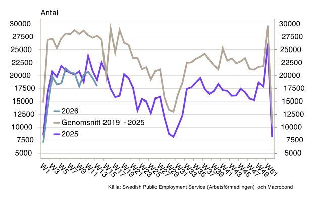 I andra ekonomiska indikatorer som ämnar speglar den realekonomiska utvecklingen är rörelserna över lag blygsamma. Nyanmälda lediga platser från Arbetsförmedlingen sjönk i vecka 13, men rörelsen sticker inte ut och bör inte övertolkas (se diagram 6). Inköpschefsindex för Sverige, liksom för övriga Europa för mars, visade breda men samtidigt modesta nedgångar. Det bör dock noteras att merparten av dessa enkäter genomfördes under mars första hälft – stämningsläget bland företagen har troligtvis försämrats ytterligare sedan dess, vilket kommer att synas i kommande mätningar.