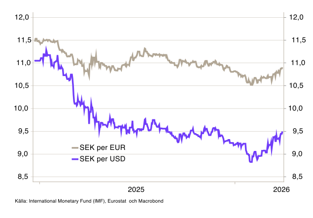 Kronan har försvagats mot euron, och ännu mer mot dollarn (se diagram B10). Dollarstyrkan kan delvis vara ett utslag av oljepriset i sig, eftersom olja prissätts i dollar och ett stigande oljepris ökar efterfrågan på den amerikanska valutan.