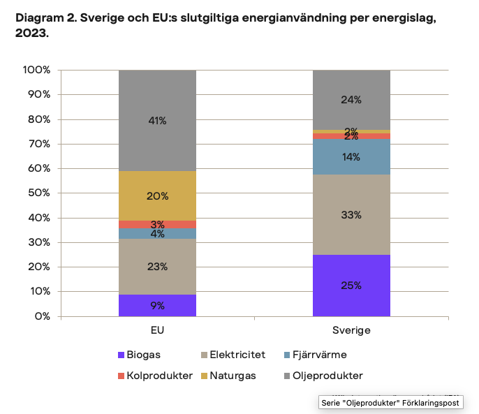 [2] Tyskland använder i större utsträckning än Sverige olja (39 procent) och naturgas (25 procent) i sin energikonsumtion och är därför mer känsligt för prisförändringar på dessa energislag. Det högre beroendet av gas gör att det finns en tydlig koppling mellan världsmarknadspriset på gaspris och tyska elpriser, eftersom gaskraft med höga rörliga kostnader ofta sätter marginalpriset.