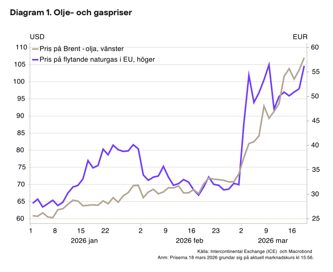Den 28 februari inledde USA och Israel gemensamma attacker mot Iran. Iran har svarat med angrepp mot Israel och amerikanska baser i närliggande länder samt både hotat och fullföljt attacker mot fartyg som passerar genom Hormuzsundet. Sundet är en avgörande passage för några av världens största oljeexportörer. Vanligtvis transporteras cirka 20 procent av all olja och naturgas i världen genom Hormuzsundet och riskerna för att bli attackerade har gjort att trafiken genom sundet i praktiken stannat av. Detta har lett till stora prisökningar på olja och naturgas (se diagram 1).