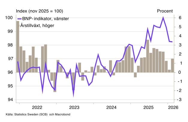 Enligt BNP-indikatorn toppade aktiviteten i svensk ekonomi i november 2025. Därefter har den fallit månad efter månad och noteras för februari nästan 2 procent under toppnivån. Det ligger nära till hands att räkna med att BNP-tillväxten för första kvartalet 2026 blir klart svagare än vad vi räknade med för en dryg månad sedan i vår konjunkturrapport. Det bör dock påpekas att BNP-indikatorn bör tolkas med viss försiktighet.