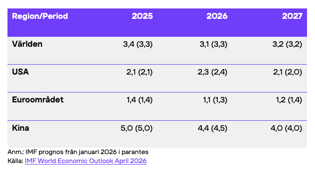 Trots att vapenvilan mellan Iran och USA förlängdes i tisdags är lägesbilden fortsatt mycket osäker. Även om kriget skulle avslutas inom en snar framtid, bedömer IMF i sin prognos från förra veckan att BNP-tillväxten blir märkbart lägre än de tidigare räknat med[1]. IMF räknar nu i sitt huvudscenario med en global tillväxt på 3,1 procent 2026, en nedrevidering med 0,2 procentenheter från sin prognos i januari. IMF konstaterar också att innan krigsutbrottet var de i ett läge att i stället revidera upp sin prognos för global BNP till 3,4 procent 2026.
